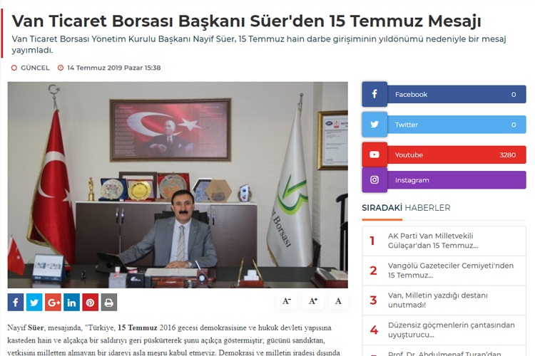 Van Ticaret Odası Başkanı Süer den 15 Temmuz Mesajı