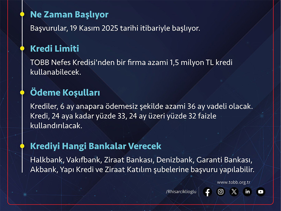 2 Ekim 2025 tarihinde başlayan TOBB Nefes Kredisi’nin ikinci paketinde 25 milyar TL olan kredi hacmi 50 milyar TL’ye yükseltildi.